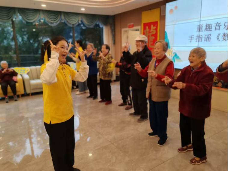 活动在一首明快的《火红的萨日朗》的音乐声中拉开序幕。在重庆人文科技学院学前教育学院谭阿斯老师、楚晶老师的专业引导下,大学生们轻握长者的手,伴着旋律律动。鼓棒轻敲,丝巾漫舞,曾经沉默的表情在音符中渐渐舒展,化为朵朵笑靥。