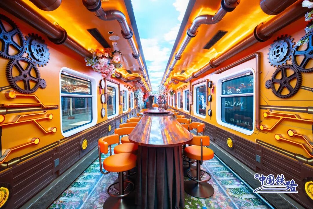 列车共有10节主题鲜明的特色车厢,分别为6节怀旧客座车厢、1节蒙太奇幻境互动演艺车厢、1节珍奇花园俱乐部车厢、1节沉浸式“时空穿梭机”车厢和1节专属VIP车厢。