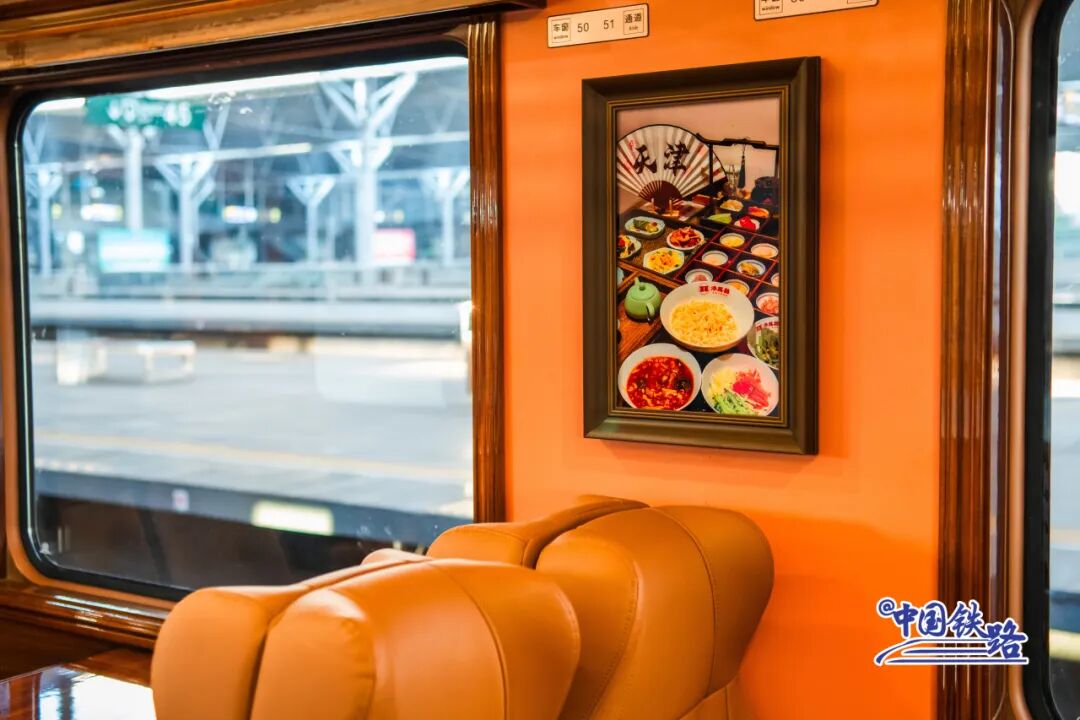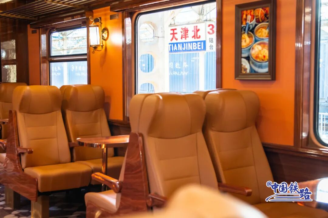 车厢外观结合天津地标元素,车厢内部装饰融合天津近代工业风与海河文化元素,每一节车厢都是一段流动的天津故事。