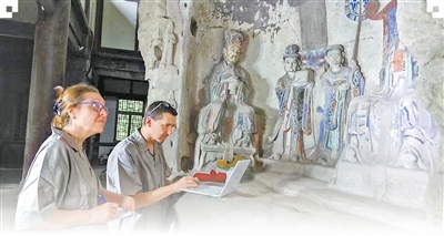 卡洛(右)与米莱拉在大足石刻开展造像病害诊断分析工作。 |