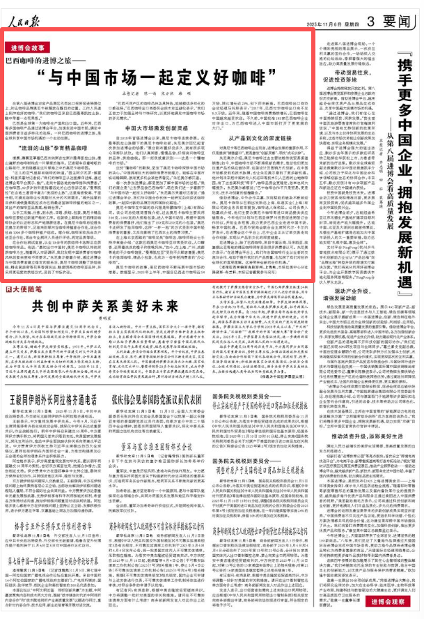 巴西是全球第一大咖啡生产国和出口国。近年来,巴西等多国咖啡产品通过进博会平台,加速走进中国市场,满足中国消费者日益多样化的选择。一杯巴西咖啡的进博之旅,是全球共享中国市场机遇的一个生动注脚。