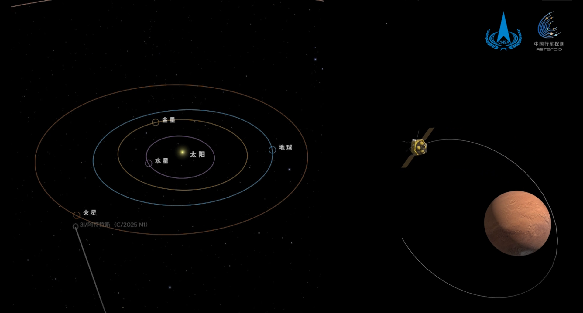 图1 星际天体阿特拉斯与天问一号火星环绕器相对位置示意图(右图是2025年10月3日相机拍摄时左图的局部放大)