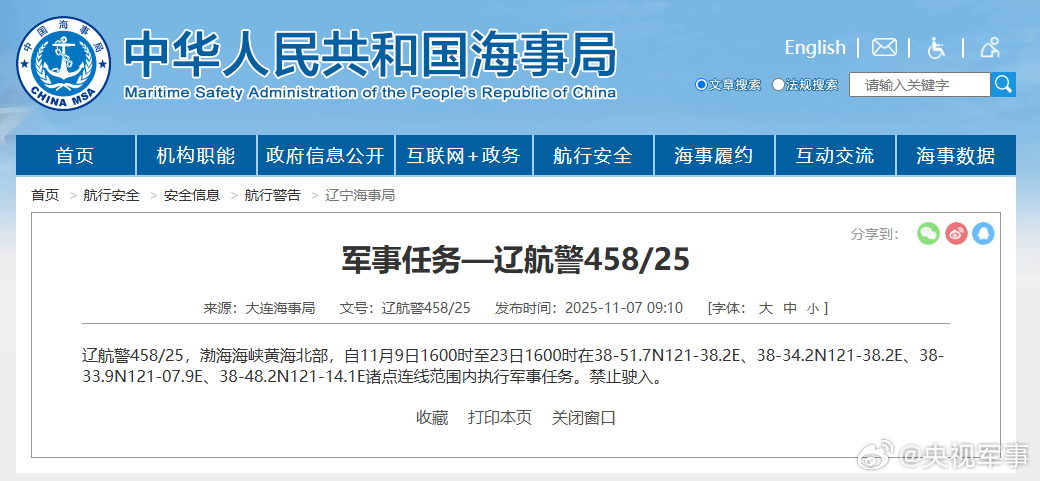 11月9日16时至23日16时,渤海海峡黄海北部部分海域执行军事任务,禁止驶入。