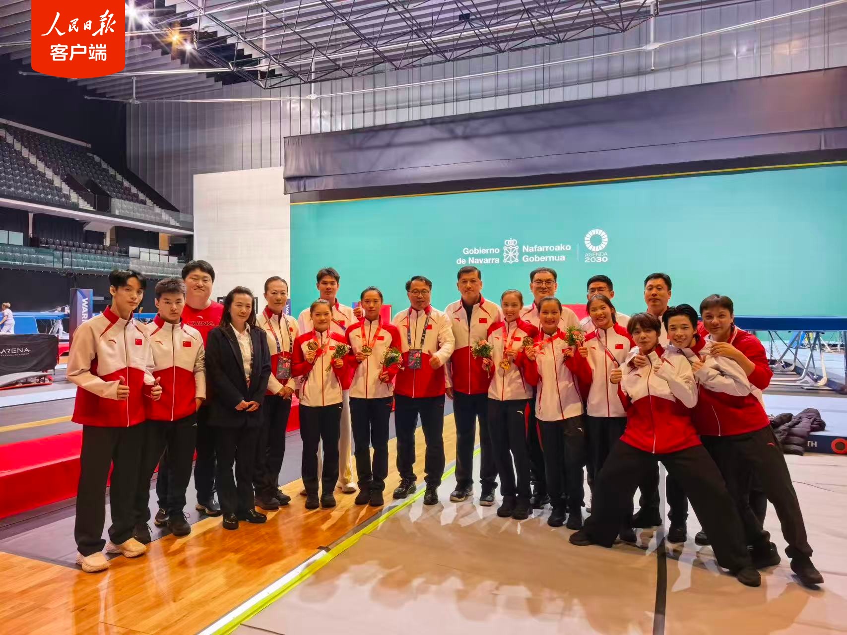 当地时间11月8日,在西班牙潘普洛纳举行的第38届世界蹦床锦标赛中,由胡译乘、范心怡、邱铮和朱雪莹组成的中国队以总成绩24分夺得女子网上团体冠军。