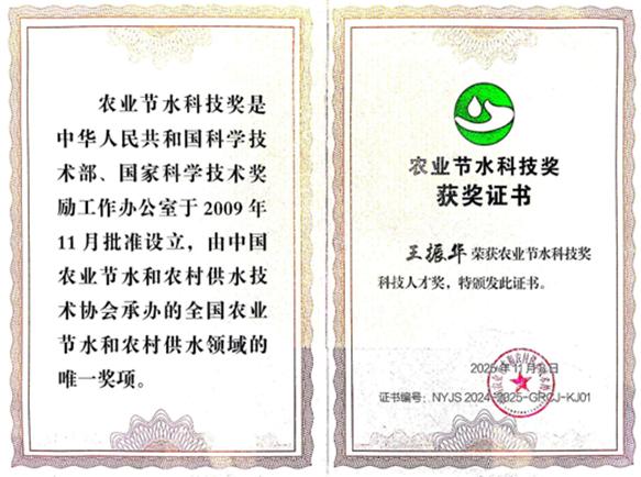 中国农业节水科技奖是由国家科学技术部、国家科学技术奖励办公室于2009年11月25日批准设定,由中国农业节水和农村供水协会承办的全国农业节水和农村供水领域的最高奖项和唯一奖项。本届中国农业节水科技奖表彰奖励包括科技成果奖49项、个人成就奖10人(其中科技人才奖3人、管理人才奖2人、青年人才奖5人),王振华因在“干旱区节水灌溉理论技术与关键装备”领域的杰出贡献被授予该奖项,系西北地区本年度唯一获此殊荣的科技工作者。