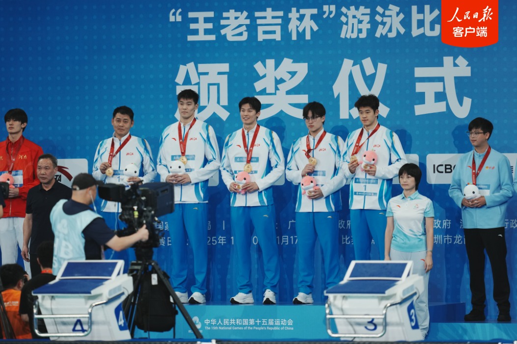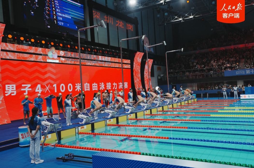全运会游泳男子4X100米自由泳接力决赛,浙江队何峻毅 、汪顺 、沈加豪、潘展乐出战,以3分15秒01的成绩夺得金牌,汪顺夺得全运会第16枚金牌,潘展乐夺得本届全运会首金,河南队和中国公安体育协会获得二三名。