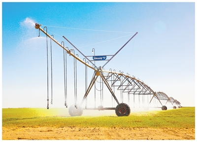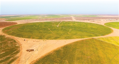 在埃及沙漠腹地,中国中曼集团的喷灌系统正在进行灌溉作业。 |