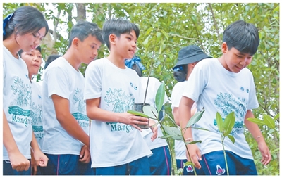 当地学生在泰国攀牙湾国家公园参加中泰红树林生态保护系列活动,体验红树林种植。 |