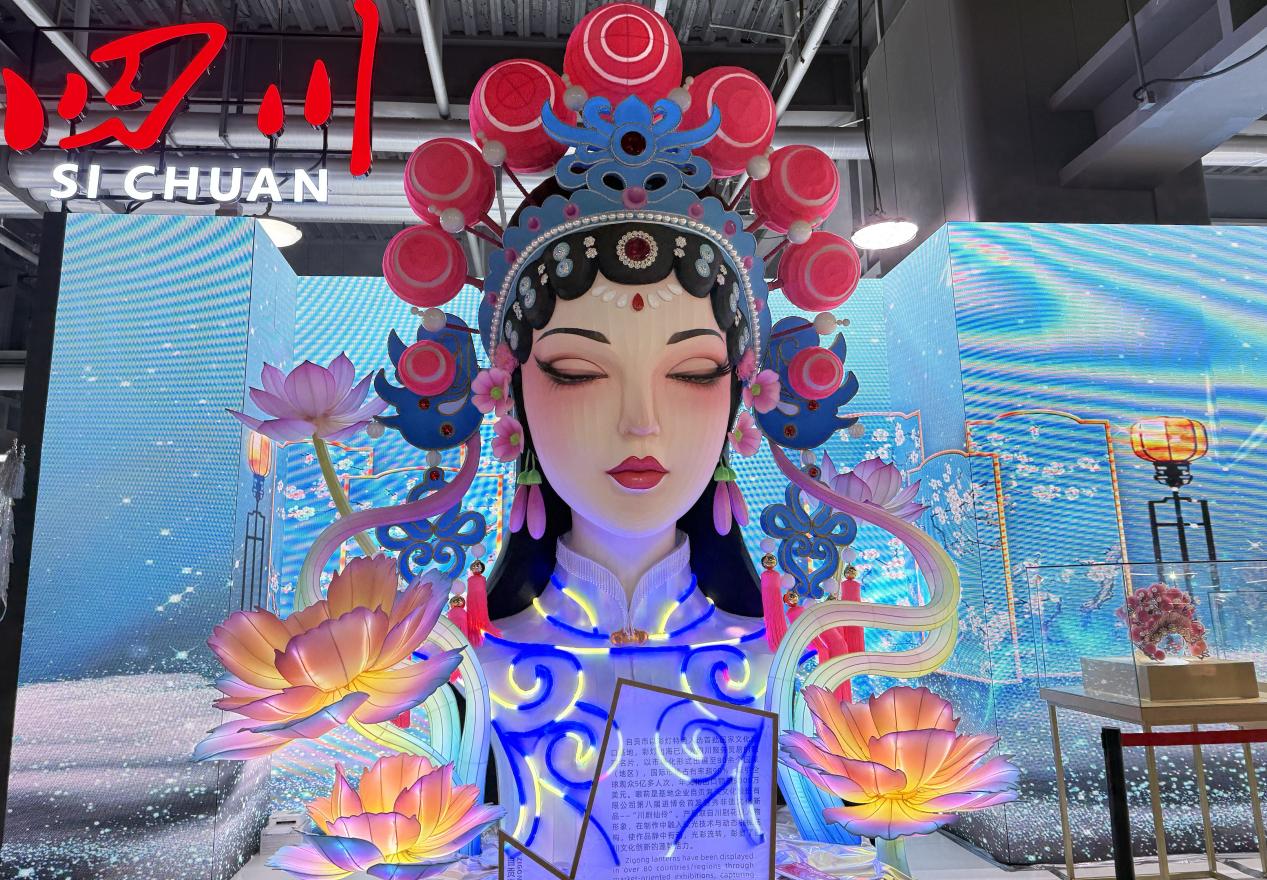在四川展区,自贡海天文化股份有限公司带来的首发首秀非遗文化新品、自贡彩灯“川剧仙伶”成了展厅里的一抹亮色。作品取自川剧花旦人物形象,加入变光技术与动态机械结构,静中有动,光彩流转。