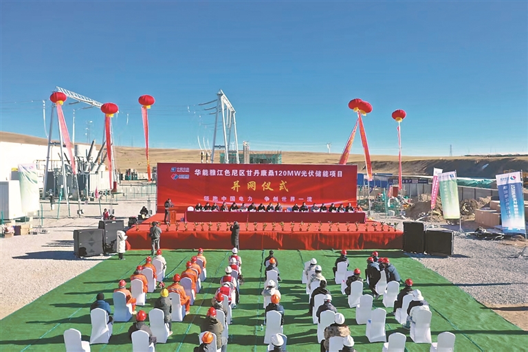 华能雅江色尼区甘丹康桑120MW光伏储能项目并网仪式现场(资料图片)。图片由那曲市能源局提供