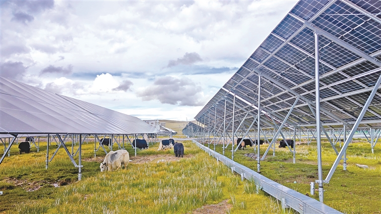 记者了解到,那曲市充分结合牧业发展实际情况,以“牧光互补”的形式新建光伏项目,将光伏板高度设置不低于1.8米,不挤占草地,便于牛羊等牲畜觅食休憩,确保放牧与发电“两不误”,促进光伏与畜牧业高度融合发展,不仅高效利用了土地资源,而且对带动群众增收、推进乡村振兴产生了示范作用。