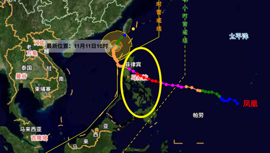11月12日18时,中央气象台继续发布台风蓝色预警。12日晚,台风“凤凰”在台湾屏东县恒春镇沿海登陆。此前,“凤凰”已于9日以强台风级别登陆菲律宾,造成严重破坏。