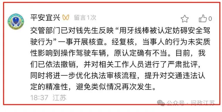 11月12日傍晚,无锡宜兴市交管部门表示,经复核,当事人的行为未实质性影响到操作驾驶车辆,原认定确有不当。目前,已依法撤销,并对相关工作人员进行了严肃批评,同时,将进一步优化执法审核流程,提升对交通违法认定的精准性,避免类似情况再次发生。