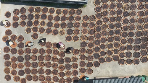 黄姚豆豉起源于明朝初期,采用昭平县黄姚镇特有的黑豆和天然古井水制作,需要经过洗豆、隔水干蒸、发酵和晾晒等10余道工艺,最终制成乌黑油润、香气浓郁的成品。