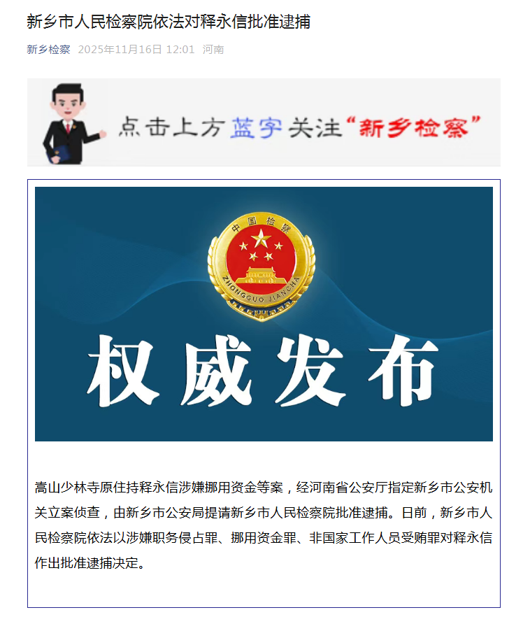 嵩山少林寺原住持释永信涉嫌挪用资金等案,经河南省公安厅指定新乡市公安机关立案侦查,由新乡市公安局提请新乡市人民检察院批准逮捕。日前,新乡市人民检察院依法以涉嫌职务侵占罪、挪用资金罪、非国家工作人员受贿罪对释永信作出批准逮捕决定。