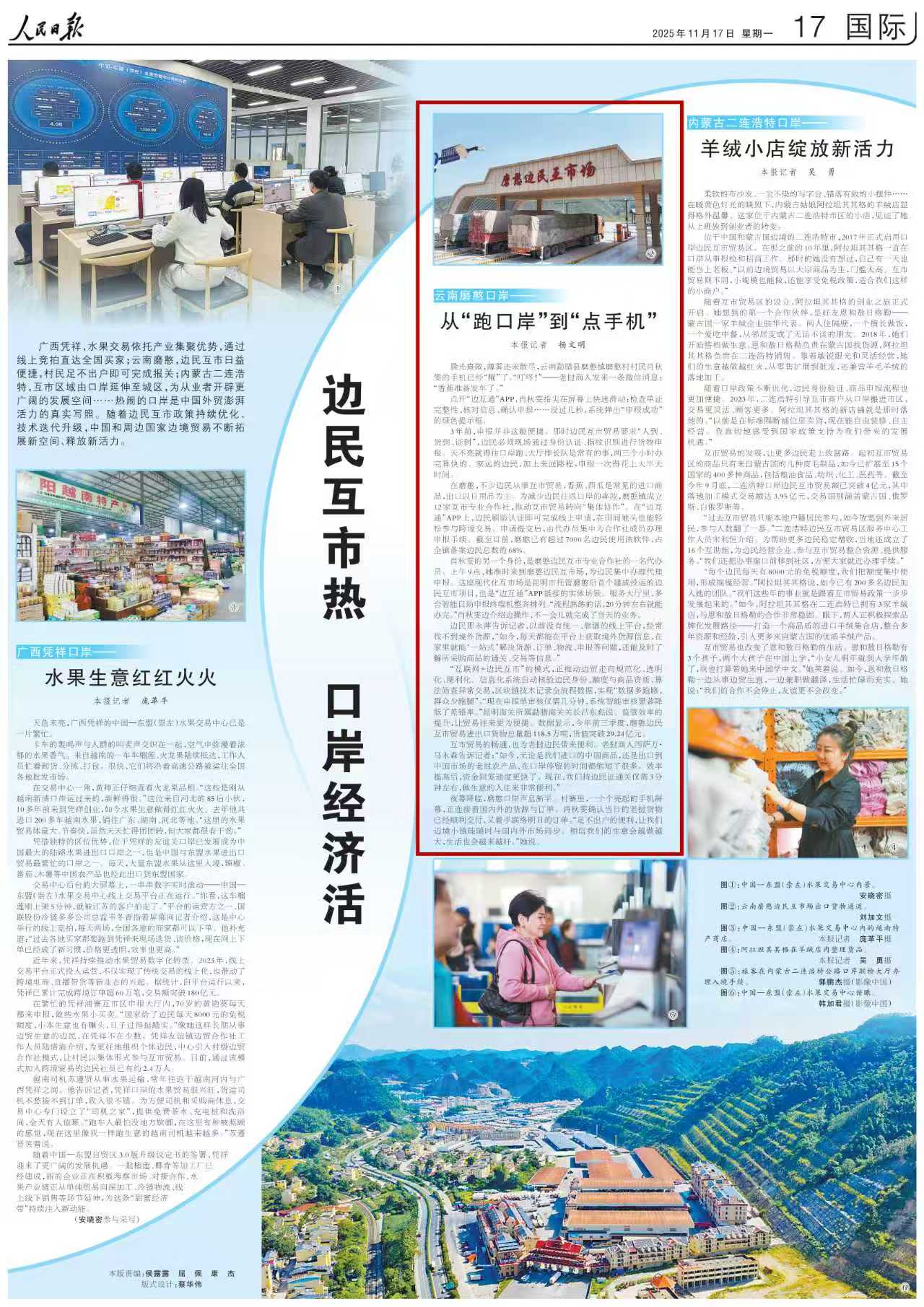 “互联网+边民互市”的模式,正推动边贸走向规范化、透明化、便利化。信息化系统自动核验边民身份、额度与商品资质,算法筛查异常交易,区块链技术记录全流程数据,实现“数据多跑路,群众少跑腿”。“现在申报单审核仅需几分钟,系统智能审核显著降低了差错率。”昆明海关所属勐腊海关关长吕东彪说。监管效率的提升,让贸易往来更为便捷。数据显示,今年前三季度,磨憨边民互市贸易进出口货物总量超118.5万吨,货值突破29.24亿元。
