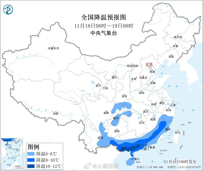 受强冷空气影响,预计,11月18日08时至11月19日08时,四川东部和南部、重庆、江西东部和南部、浙江南部、云南东部、广西、广东、福建、海南岛等地大部将先后降温6~8℃,其中,广西南部、广东西南部等地部分地区降温可达10℃。最低温度0℃线将南压到苏皖南部至湖北中部一带。