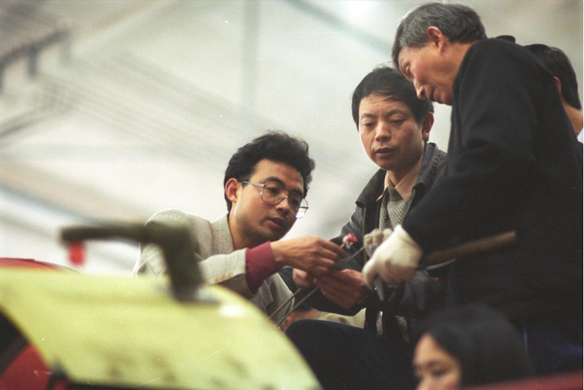 歼-10飞机总设计师宋文骢(左一)、时任成飞总经理侯建武(右一)等人在研制现场交流