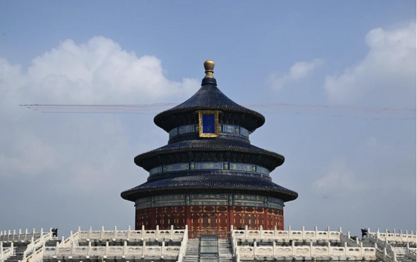在纪念中国人民抗日战争暨世界反法西斯战争胜利80周年大会上,歼-10表演机飞过天坛