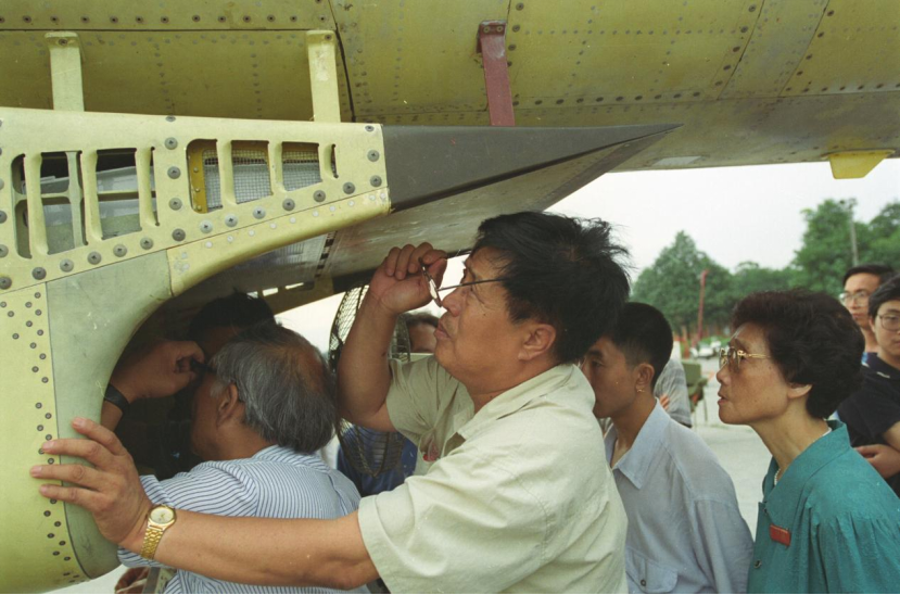 首飞前,歼–10飞机现场总指挥杨宝树(左二)在检查进气道