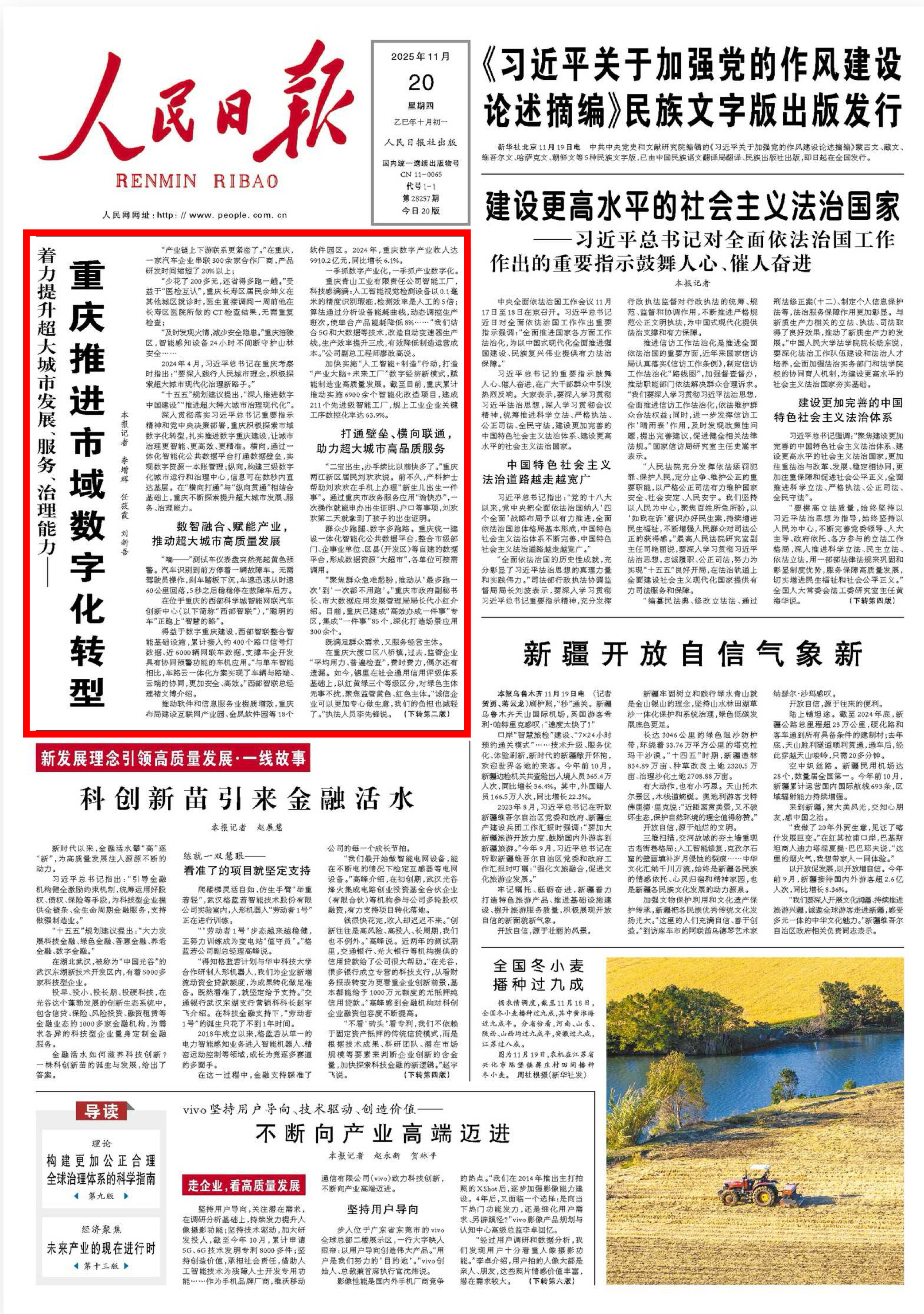 深入贯彻落实习近平总书记重要指示精神和党中央决策部署,重庆积极探索市域数字化转型,扎实推进数字重庆建设,让城市治理更智能、更高效、更精准。横向,通过一体化智能化公共数据平台打通数据壁垒,实现数字资源一本账管理;纵向,构建三级数字化城市运行和治理中心,信息可在数秒内直达基层。在“横向打通”与“纵向贯通”相结合基础上,重庆不断探索提升超大城市发展、服务、治理能力。