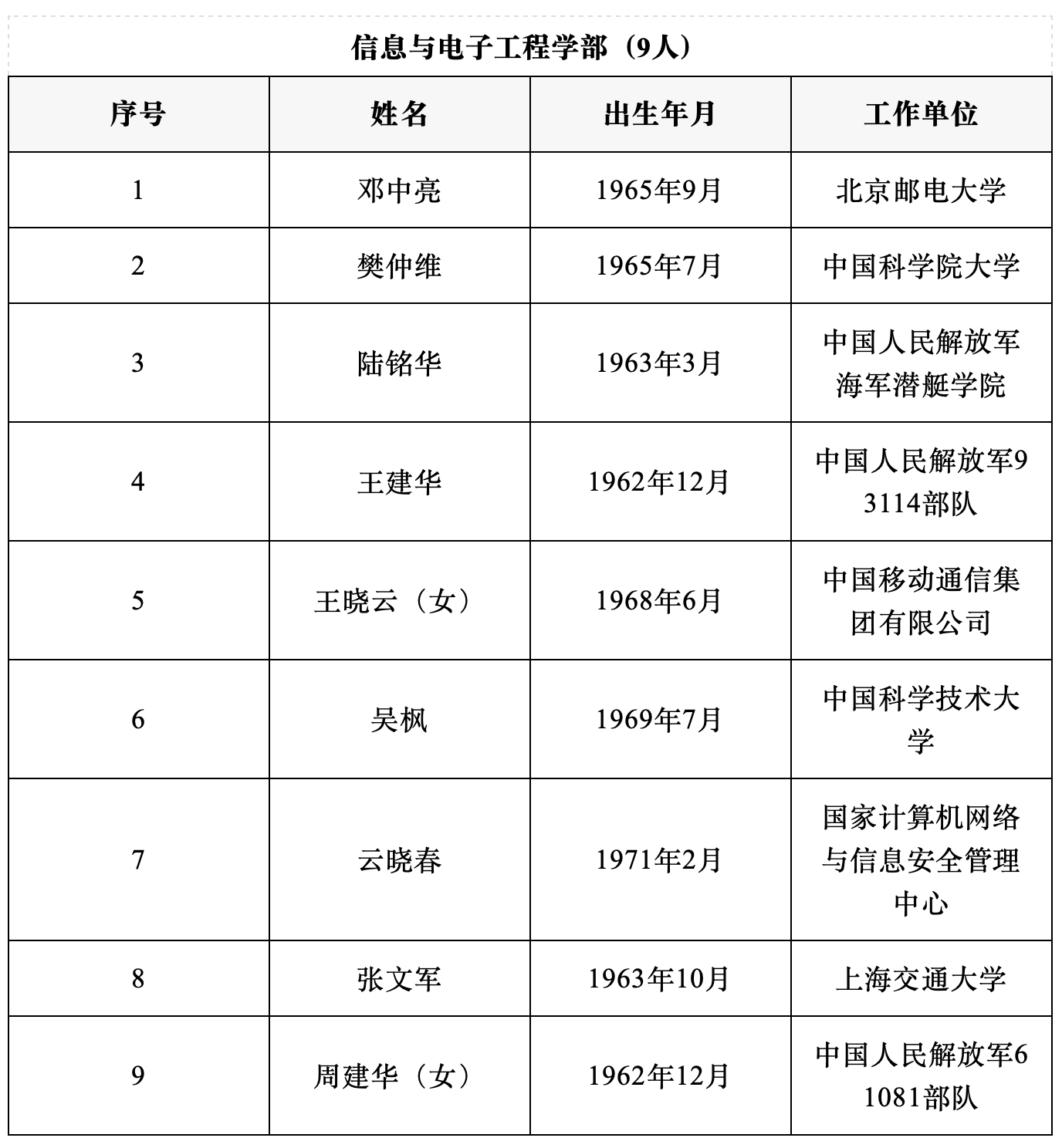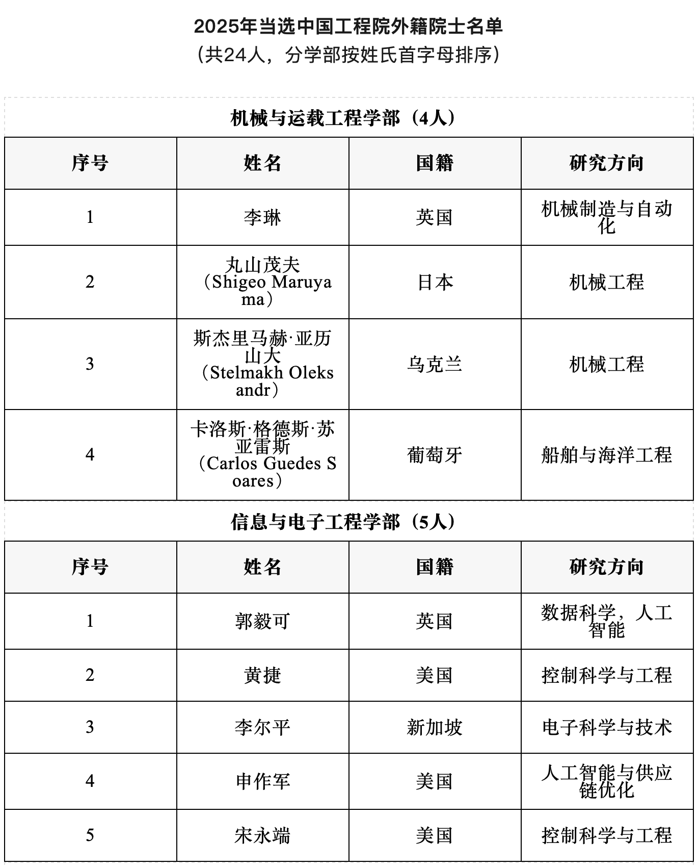 本次增选后,中国科学院院士总数为908人,外籍院士总数为173人;中国工程院院士总数为1002人,外籍院士总数为148人。