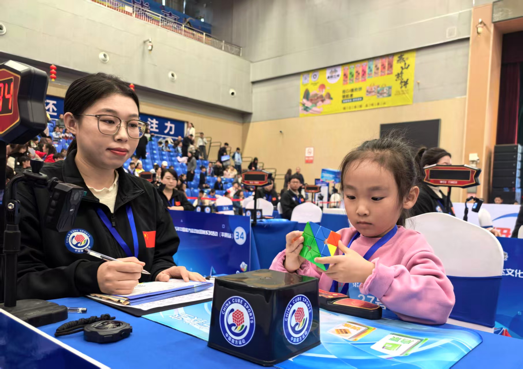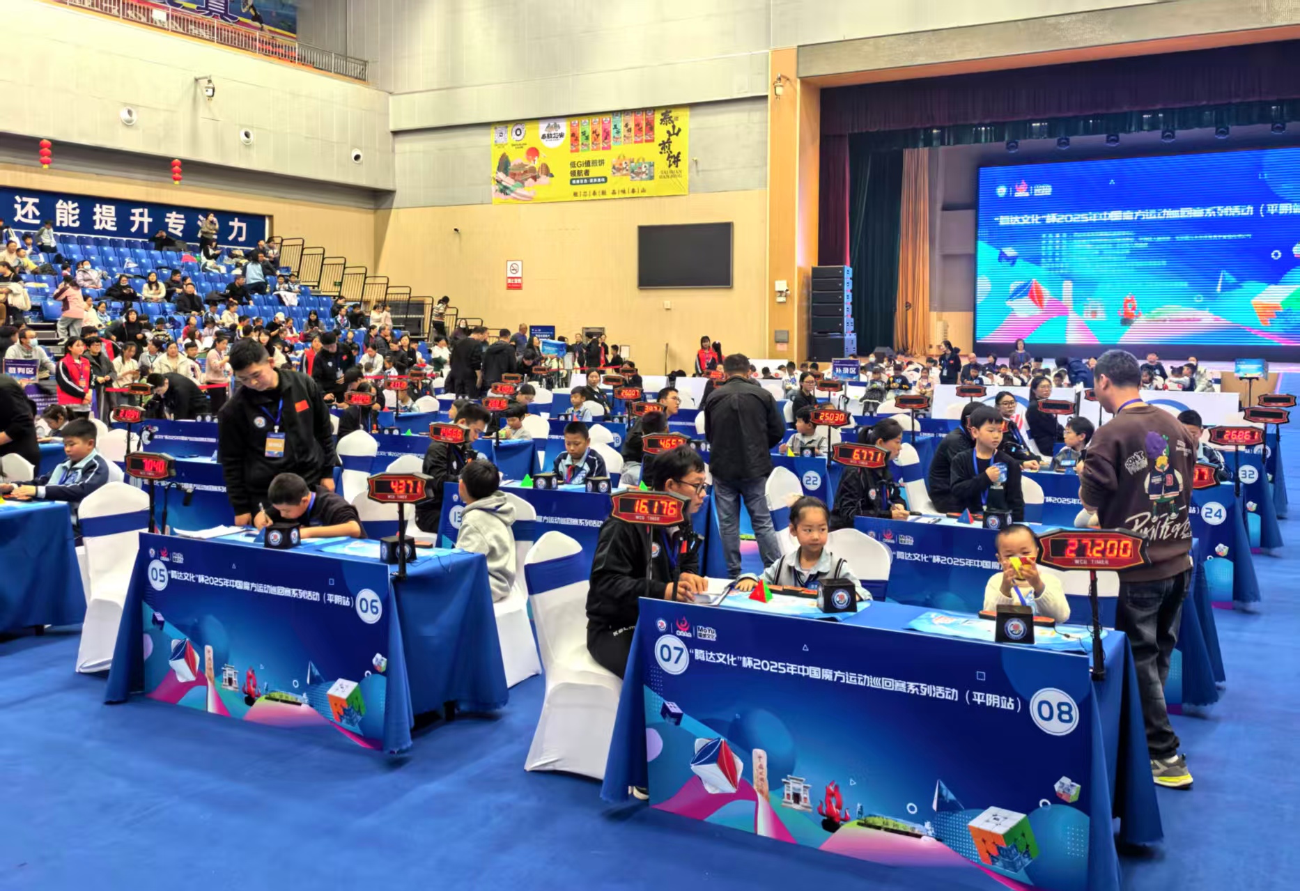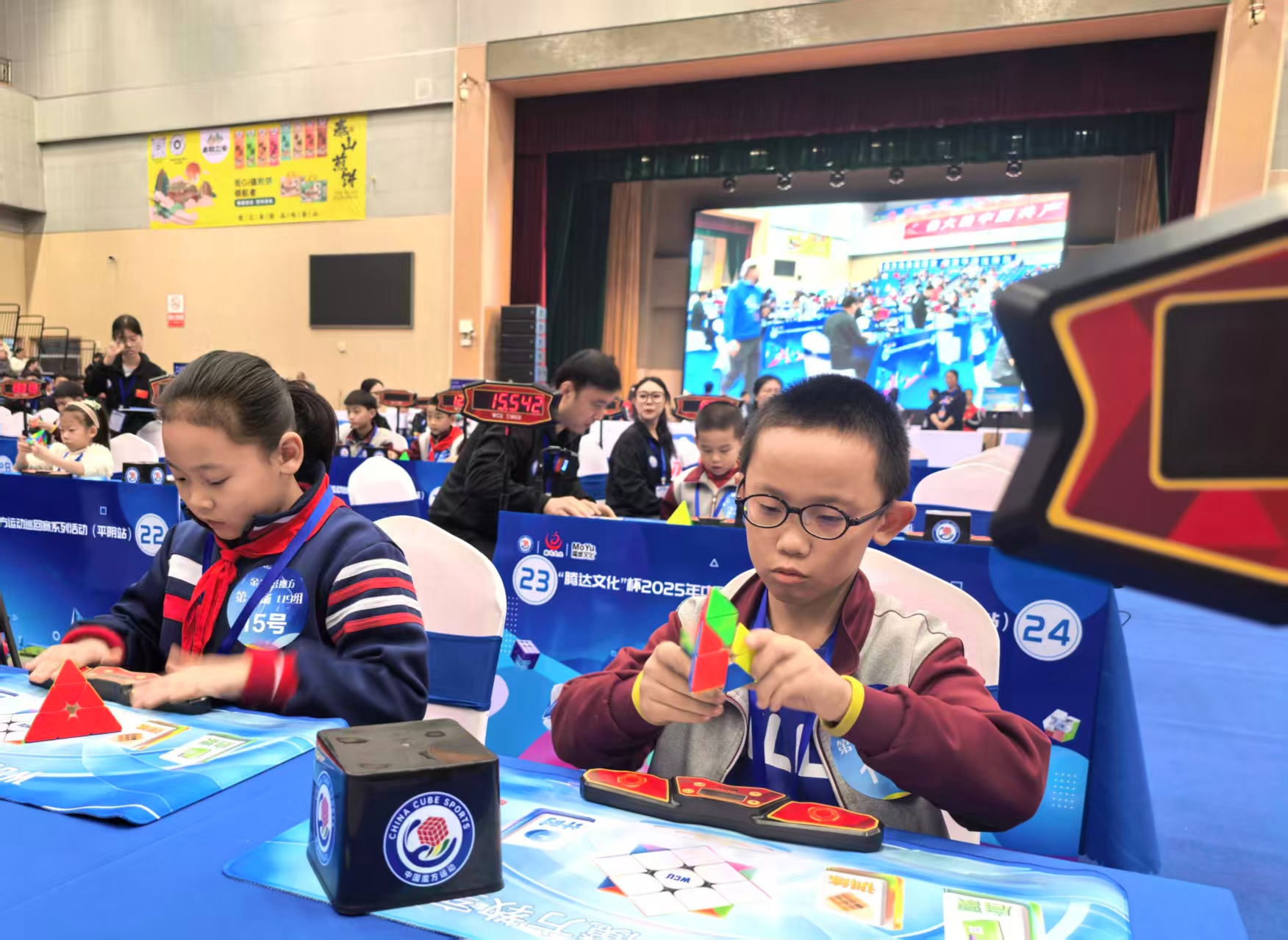 随着嘉宾共同触碰启动大屏,2025中国魔方运动巡回赛平阴站正式开赛,选手们迅速投入紧张激烈的角逐,三阶速拧、四阶盲拧等项目轮番上演,计时器上跳动的数字记录着选手们的专注与速度。