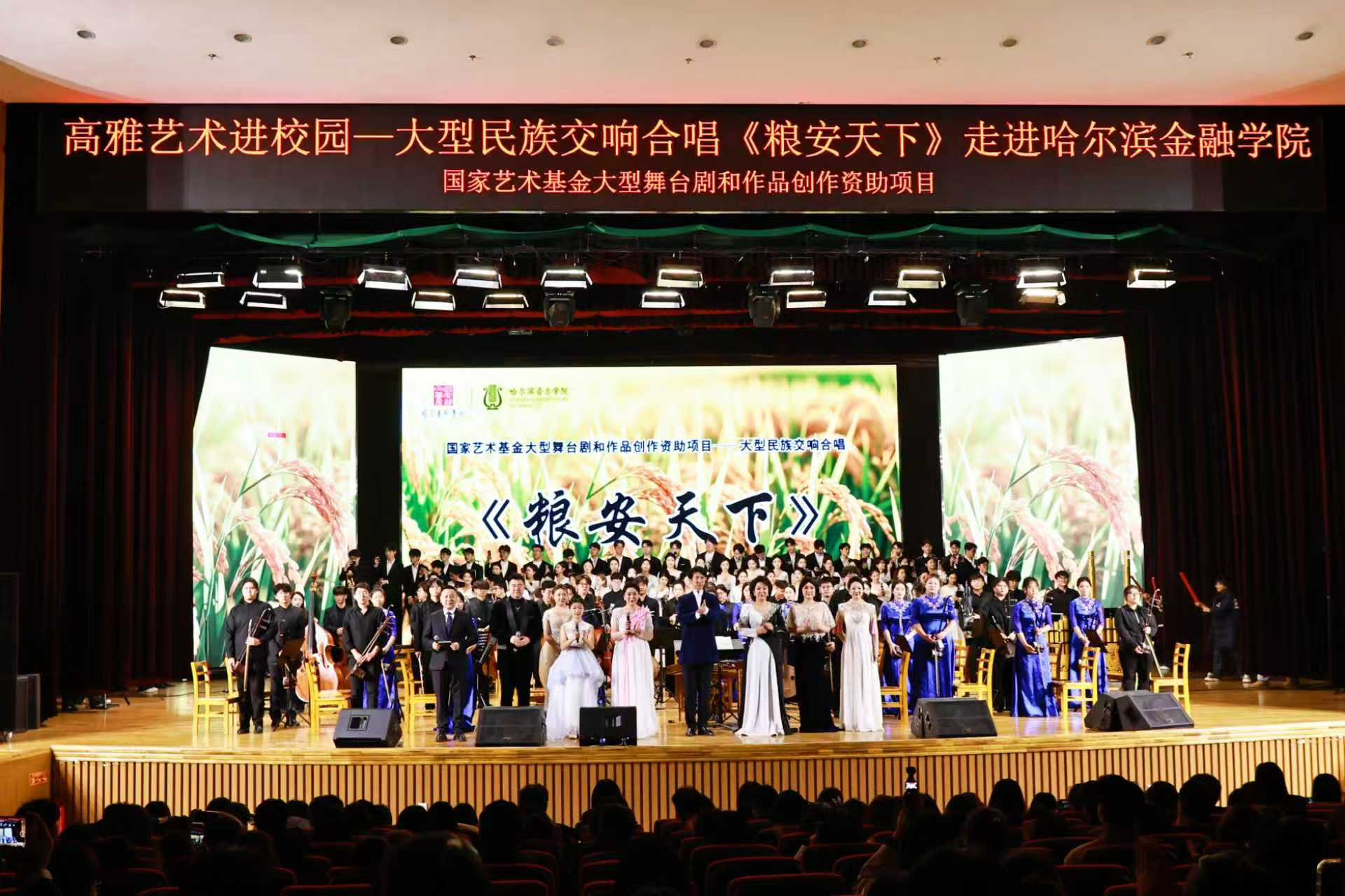 “乐说”粮食安全 ,“艺赞”龙江担当。11月23日晚,由哈尔滨音乐学院倾力打造,黑龙江省文化和旅游厅、黑龙江省文学艺术界联合会、哈尔滨市文化广电和旅游局、哈尔滨音乐厅共同推出的国家艺术基金资助项目——大型民族交响合唱《粮安天下》在哈尔滨金融学院成功上演。这场演出也是该项目的“收官之战”。据统计,自首演以来,大型民族交响合唱《粮安天下》已成功演出16场,线上线下观众达10余万人次,受到广泛赞誉和好评。有观众评论:《粮安天下》用音乐“诉说”了粮食安全对国家与民族的重要意义,用艺术礼赞了龙江大地在守护“中国饭碗”中的使命与担当。