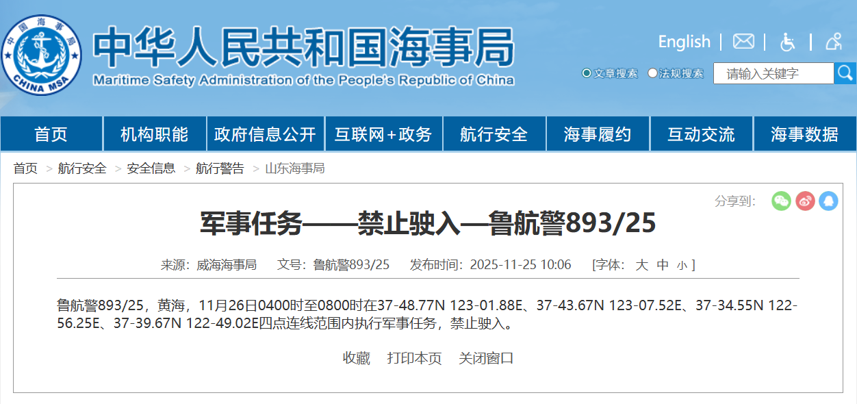 据中国海事局网站消息,威海海事局发布航行警告,11月26日4时至8时,黄海部分海域执行军事任务,禁止驶入。