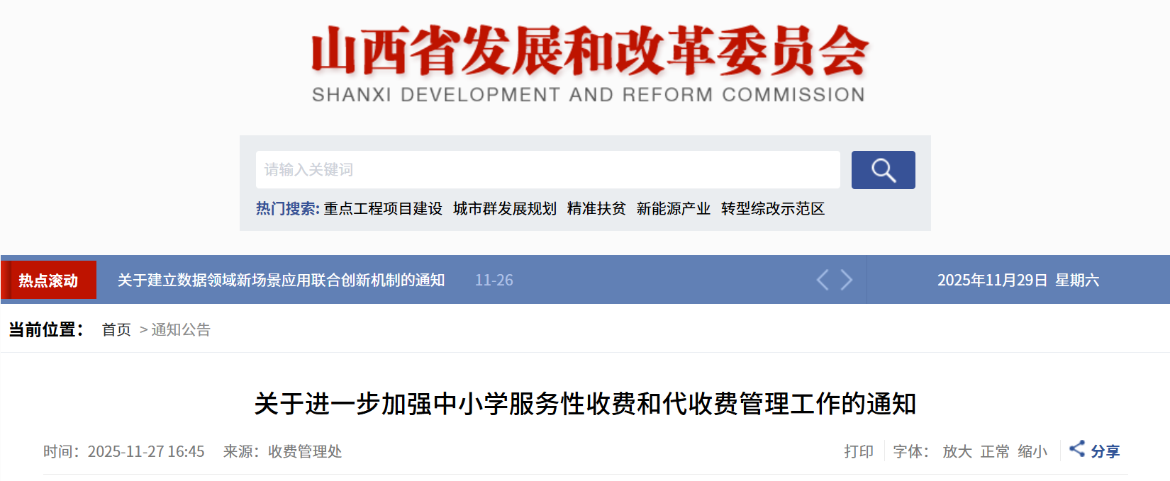 近日,山西省发展和改革委员会、山西省教育厅和山西省财政厅联合发布《关于进一步加强中小学服务性收费和代收费管理工作的通知》(以下简称《通知》),进一步规范全省中小学服务性收费和代收费行为,切实维护学校和学生合法权益。通知自2026年1月1日起执行,有效期5年。