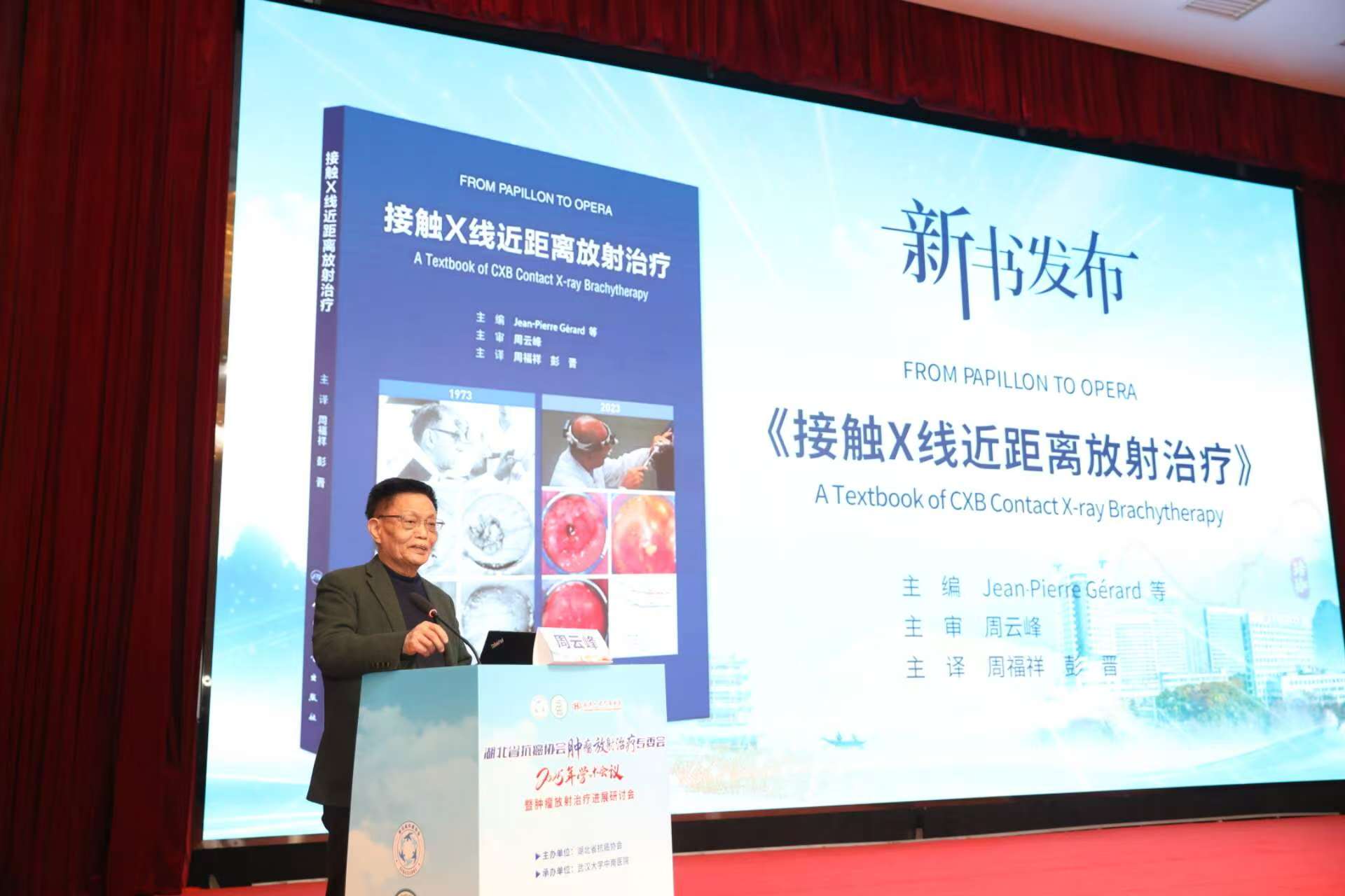 近日,由人民卫生出版社出版发行的《接触X线近距离放射治疗》新书发布会在汉举行。该书由法国放疗名家Jean-Pierre Gérard教授主编,武汉大学医学部原部长、中南医院原院长周云峰教授主审,中南医院肝胆胰与骨软组织肿瘤放化疗科主任周福祥和副主任彭晋主译,该院杨垒、王文博、江换钢、於海军、王骁踊等多位专家参与翻译。本书是我国首部系统引介接触X线近距离放射治疗(CXB)技术的权威著作。