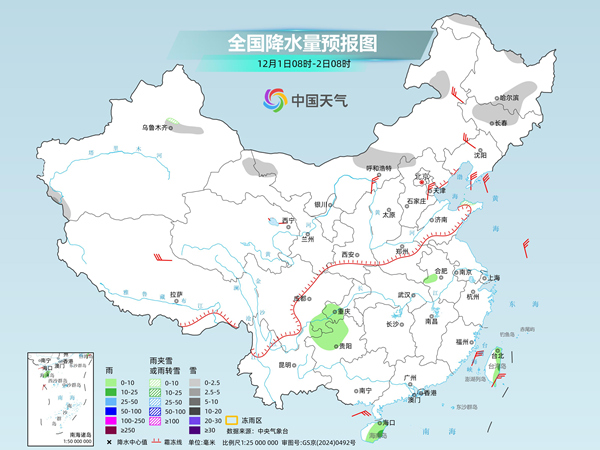 明天,内蒙古、黑龙江北部和南部、吉林北部、新疆沿天山地区及南疆盆地西部山区、甘肃河西、河北北部等地部分地区有小到中雪或雨夹雪。四川东南部、重庆西部、贵州西北部、安徽中部、海南岛、台湾岛等地部分地区有小到中雨。