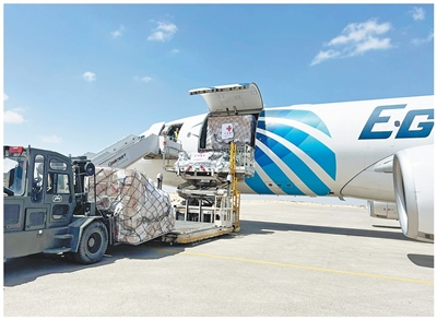 2024年4月19日,工作人员在埃及阿里什国际机场卸载中国援助巴勒斯坦的物资。新华社发