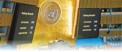 9月12日,联合国大会通过决议,支持关于和平解决巴勒斯坦问题及实施“两国方案”的纽约宣言。图为会场显示屏显示投票结果。