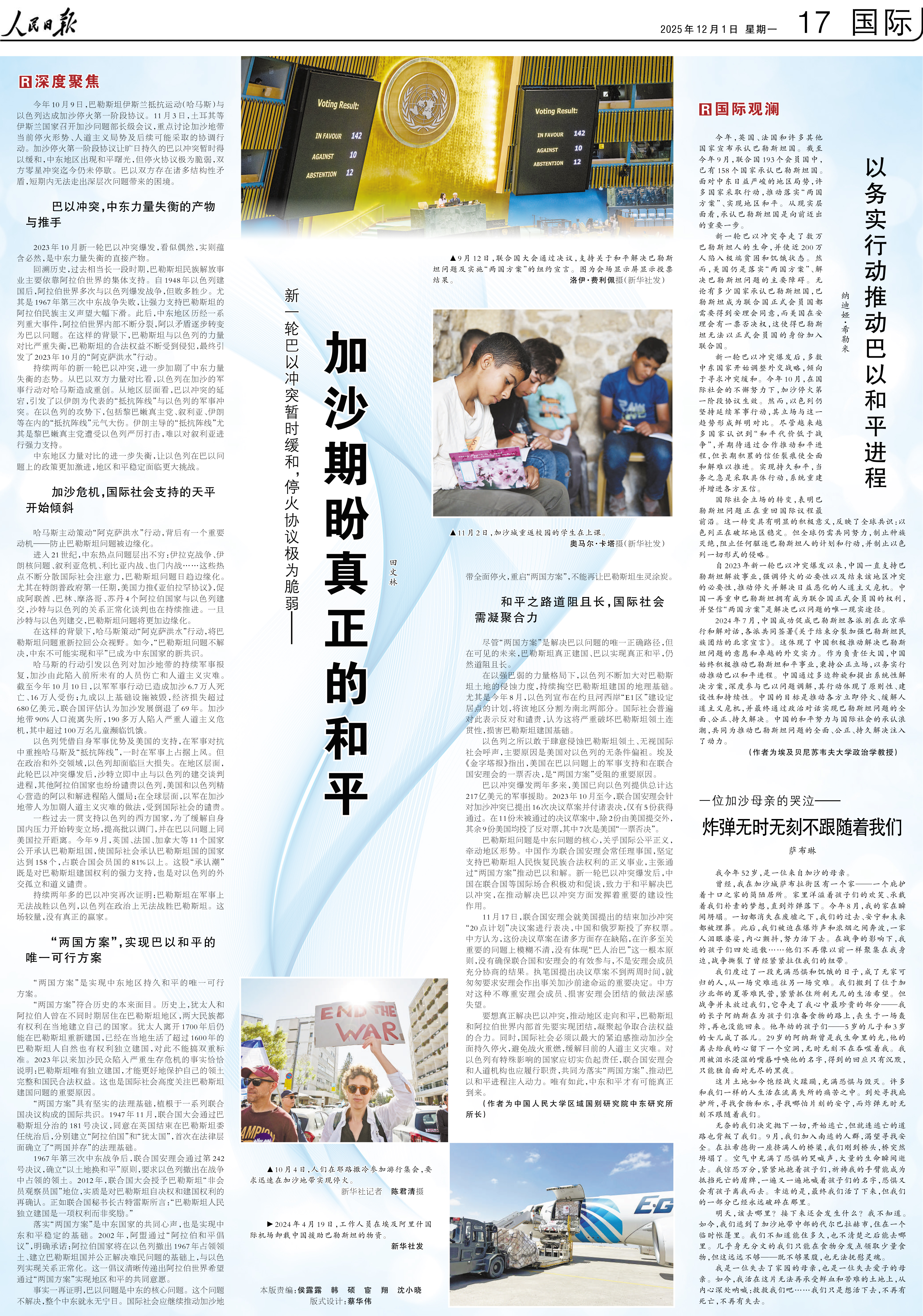 新一轮巴以冲突夺走了数万巴勒斯坦人的生命,并使近200万人陷入极端贫困和饥饿状态。然而,美国仍是落实“两国方案”、解决巴勒斯坦问题的主要障碍。无论有多少国家承认巴勒斯坦国,巴勒斯坦成为联合国正式会员国都需要得到安理会同意,而美国在安理会有一票否决权,这使得巴勒斯坦无法以正式会员国的身份加入联合国。