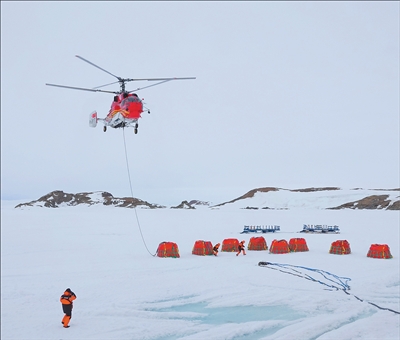 “雪鹰102”直升机从“雪龙”号甲板飞至“雪龙2”号船侧冰面作业点,开启油囊吊挂作业。