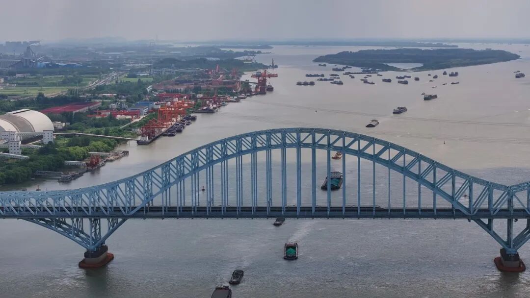 长江下游南京段,货轮依次过桥。交通运输部长江航务管理局供图