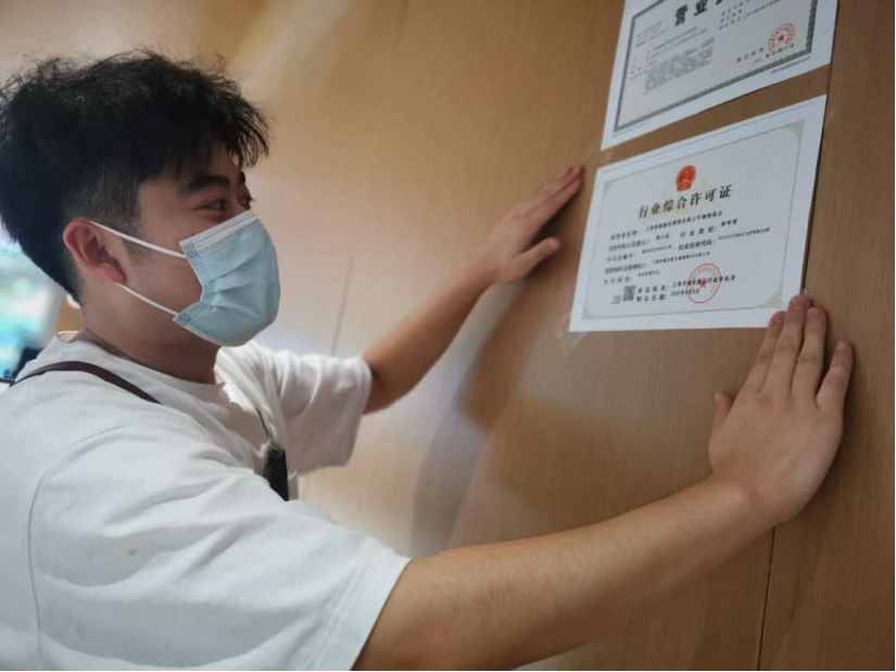 线上办理完成,店员开心地贴上营业执照和行业综合许可证。