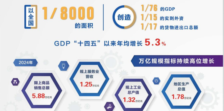 资金、企业、人才,密度还在进一步加强。2020年,浦东以全国1/8000的面积创造了1/80的GDP,2024年增长到1/76。2024年,浦东地区生产总值1.78万亿元,是2020年的1.34倍,占上海全市32.9%;规上工业总产值1.32万亿元,是2020年的1.27倍,占全市33.6%;规上服务业营收1.25万亿元,是2020年的1.61倍,占全市21.2%;货物进出口总额2.61万亿元,是2020年的1.25倍,占全市61.1%;限上商品销售总额5.88万亿元,是2020年的1.34倍,占全市37.3%。