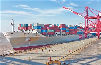 图为靠泊上海洋山港的“钱凯—上海”海运航线船舶。上海海关供图