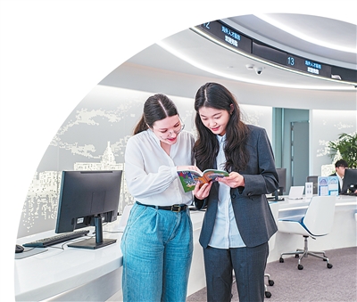 上海外滩国际人才服务中心工作人员向俄罗斯姑娘安娜(左)介绍双语小册子《“欢迎来黄浦”海外人才一本通》。 |