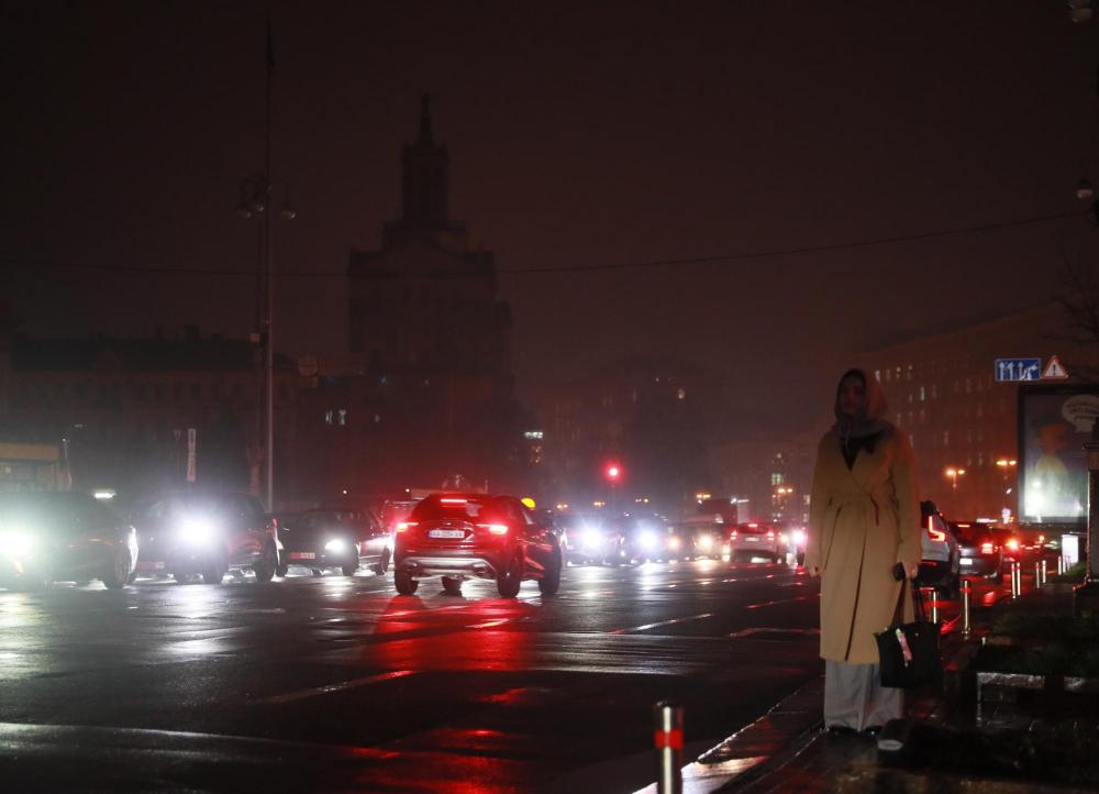 11月20日,乌克兰首都基辅主要街道的照明设施出现大面积停电,夜色中市民在路边等车。新华社记者李东旭摄