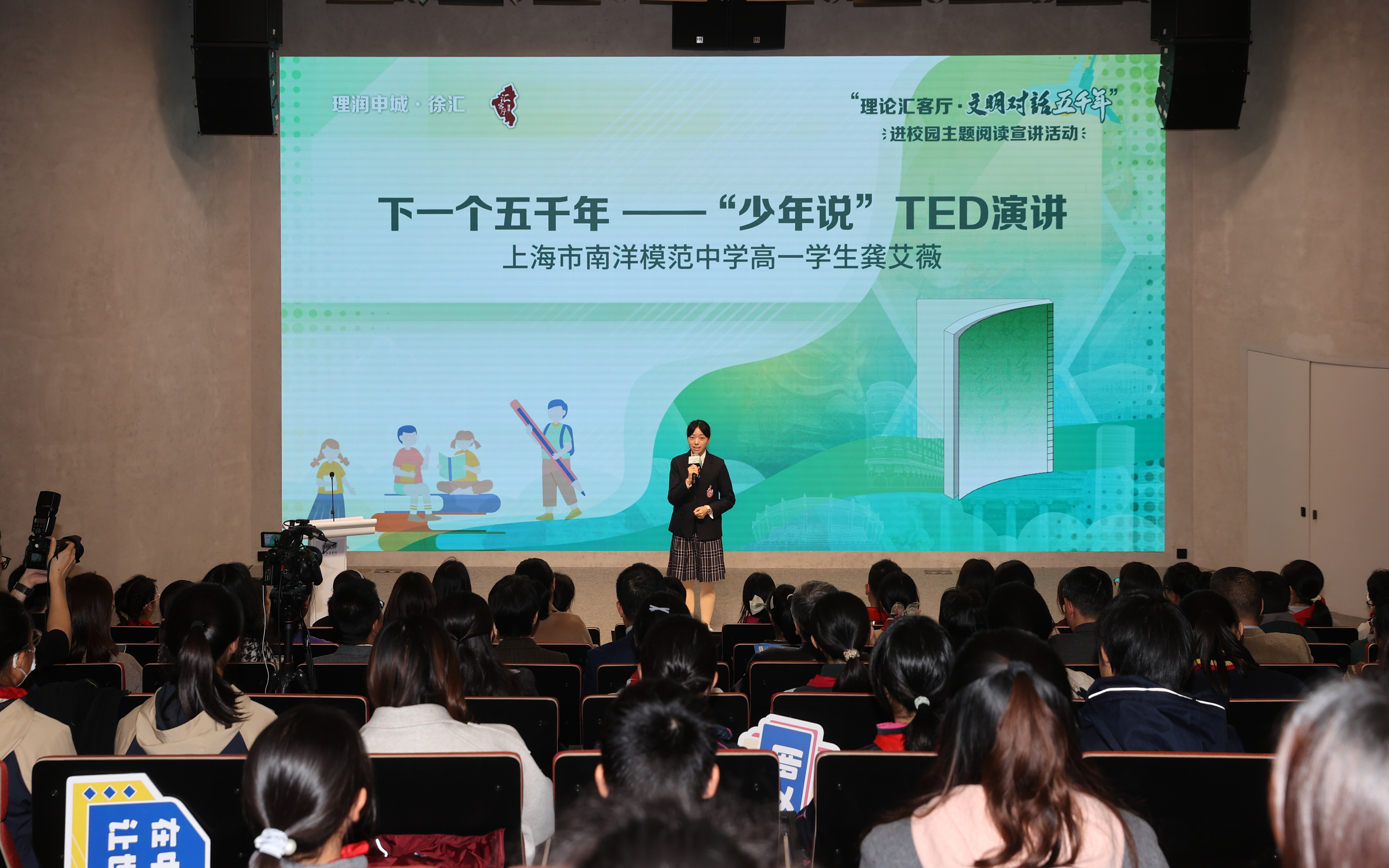 前期,上海市社联已经在南洋模范中学开展了以该丛书第一卷为引的预讲。活动上,来自南洋模范中学的龚艾薇同学带来《下一个五千年》“少年说”TED演讲,从大历史观、文明互鉴两个维度出发,分享学习心得,展现中国少年的文化自信。