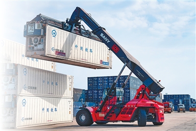 在中老铁路万象南货运口岸站,起重机吊起即将发往中国的冷链集装箱。本报亚太中心分社 苏 朋摄