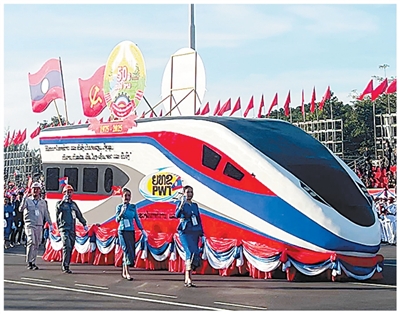 12月2日,以中老铁路“澜沧号”动车组车头为造型的花车亮相老挝建国50周年庆祝活动。米巴萨摄
