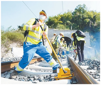 中老铁路线路工在隧道口开展起道捣固作业。周 星摄