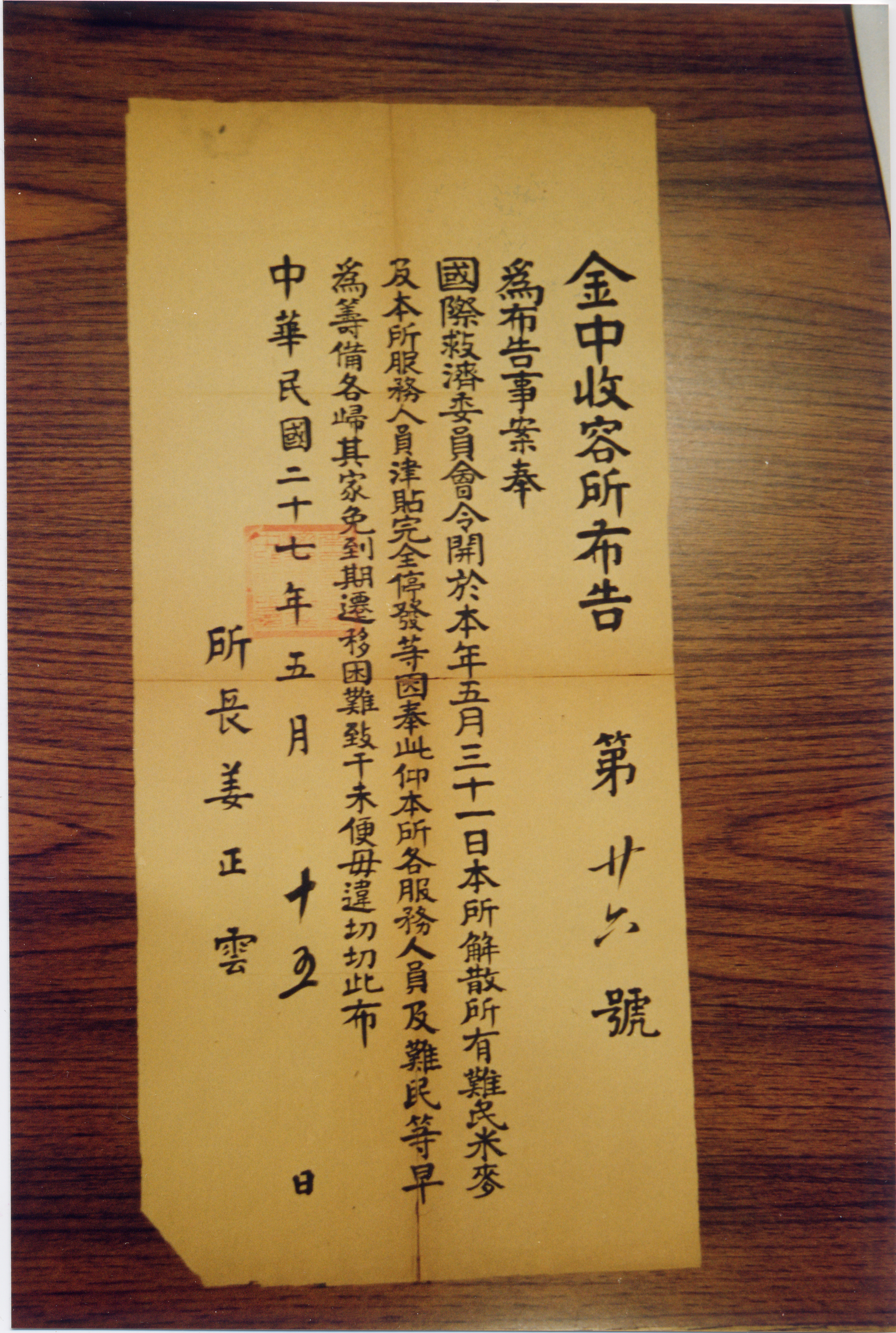 1938年5月,尚有6个收容所开放,金女大和金大附中都在其中。5月15日,金大附中贴出了姜正云手书的布告,宣布收容所将于5月31日解散。