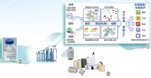 图①:生物制造流程示意图。图②:生物航煤样品。图③:生物基塑料样品。