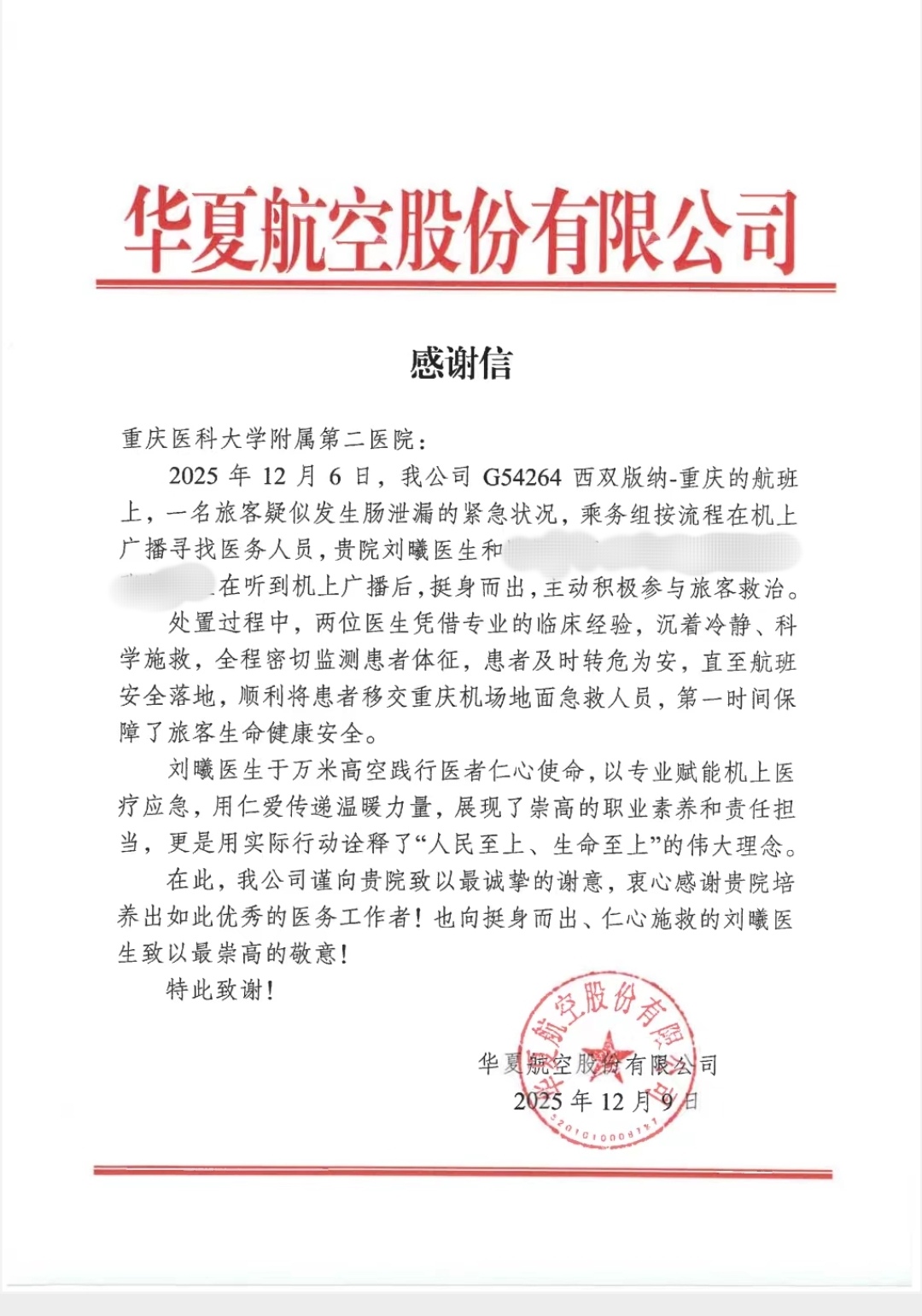 次日,航空公司专程向刘曦送上感谢信,致敬他在危急时刻展现的专业与担当。刘曦说:“作为医务工作者,救死扶伤是本职,无论何时何地,只要遇到需要帮助的人,我们都会站出来。”