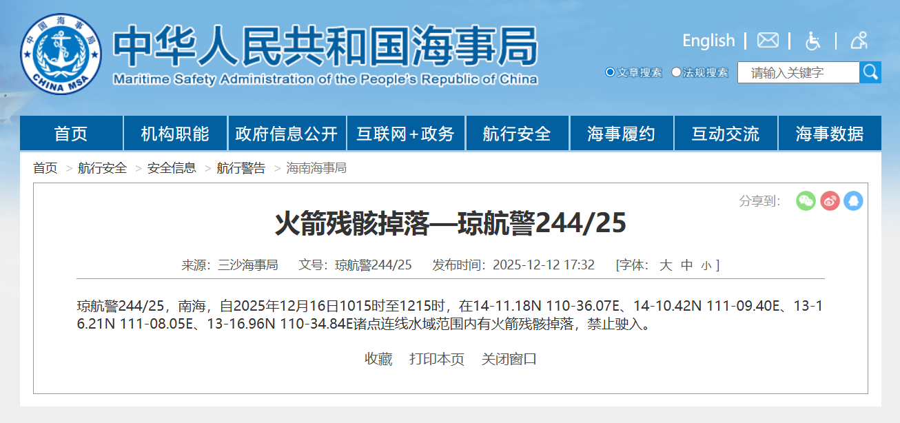 航行警告!南海部分水域范围内有火箭残骸掉落